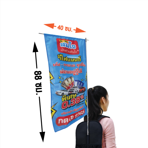ธงเป้ ธงประชาสัมพันธ์แบรนด์สินค้า โปรโมชั่นแบบเคลื่อนที่ใช้งานง่าย น้ำหนักเบา ใช้งานได้หลาก หลายสถานที่เช่น ตลาด ห้างร้าน ศูนย์การค้า งานคอนเสิร์ต งานแสดงสินค้า เป็นต้น เป็นการสร้าง ความน่าสนใจได้เป็นอย่างดีประหยัดค่าใช้จ่าย อีกทั้งยังไม่ต้องเสียค่าเช่าพื้นที่โฆษณาเหมือนกับ การโฆษณาแบบอื่นๆ และสามารถนำกลับใช้ได้หลายครั้ง