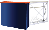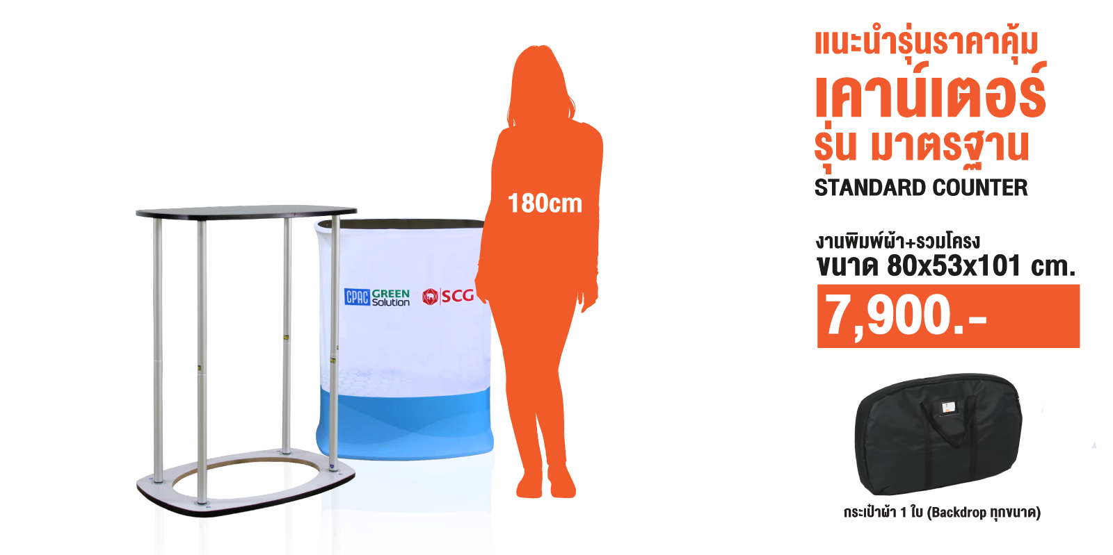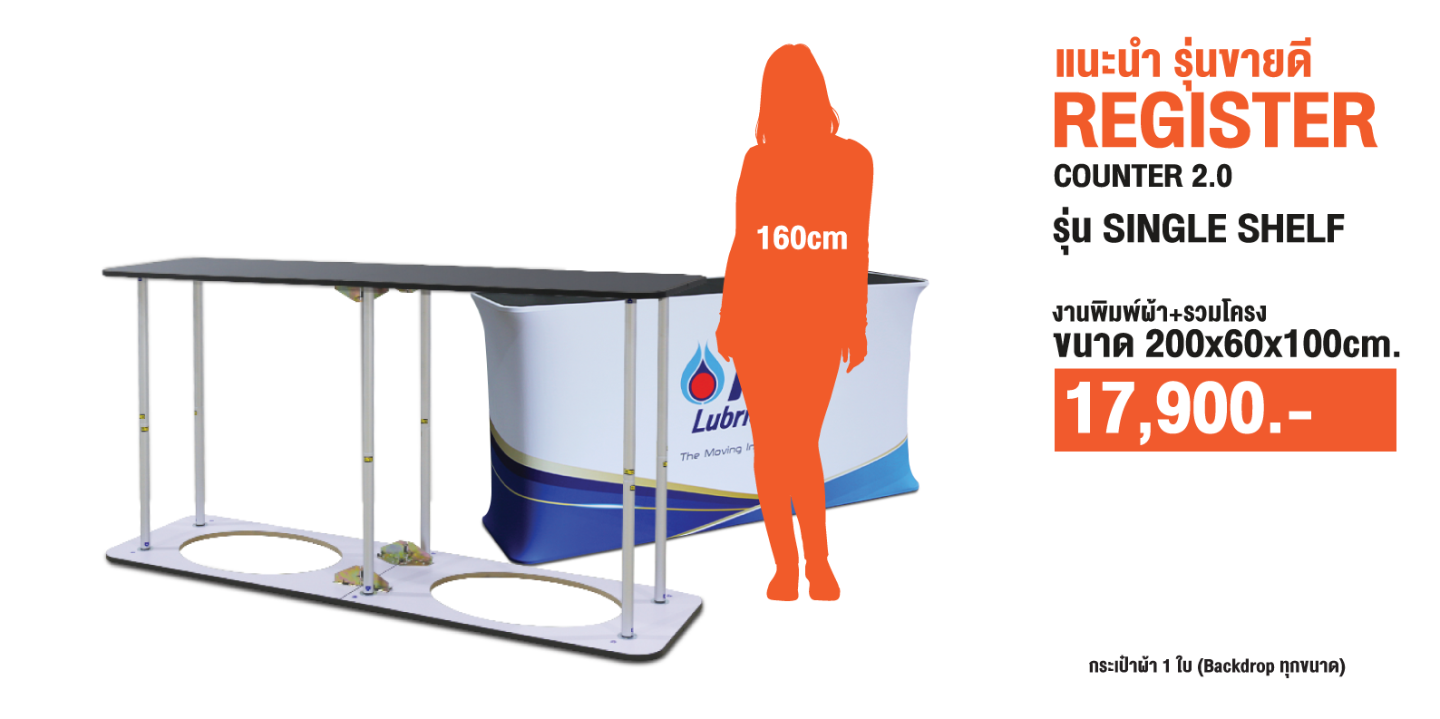 เคาน์เตอร์ผ้ารุ่น โต๊ะชงชิม เคาน์เตอร์ออกบูธ หรือบูธชงชิม (Fabric Counter) หรือเคาน์เตอร์แสดง สินค้ารูปแบบผ้ารุ่นพิเศษ สามารถพับเก็บได้ เหมาะสำหรับการใช้งานที่ต้องการเคลื่อนย้าย น้ำหนักเบา สามารถใช้คู่กับ Backdrop ผ้า สำหรับงานแสดงสินค้าและงานอีเวนท์ ด้านบนเคาน์เตอร์สามารถติดตั้ง ป้ายโลโก้จากวัสดุที่หลากหลายตามความต้องการ