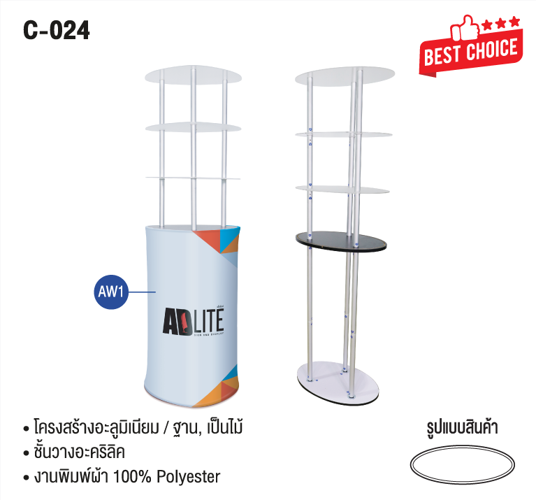 เคาน์เตอร์ผ้ารุ่นมาตรฐานมีทั้งหมด 4 รุ่น คือ Oval, Square, Long-Oval และ Round Bar เหมาะสำหรับงานเปิดตัวสิ้นค้างานโชว์สินค้า วางโชว์ออกอีเวนท์ต่างๆ ประกอบด้วยโครงอง อมิเนียม, ฐานแผ่นไม้, แผ่นไม้สำหรับวางสินค้าและงานผ้าพิมพ์