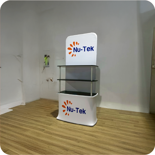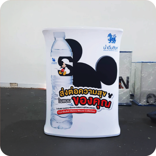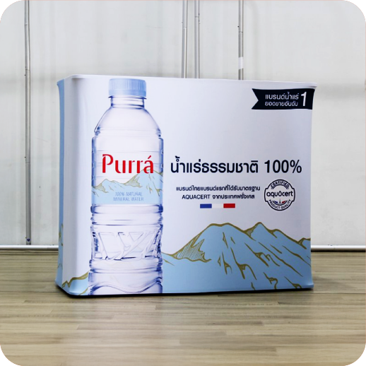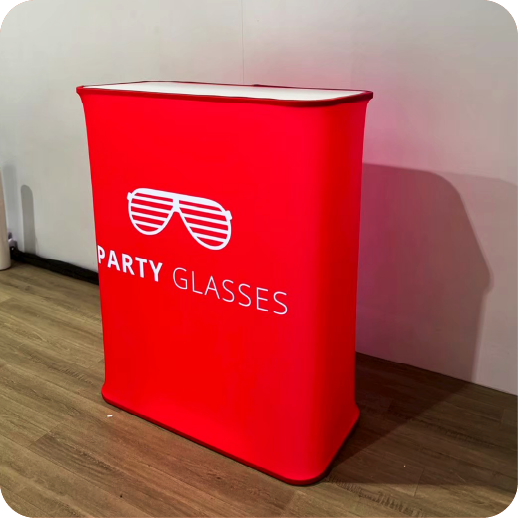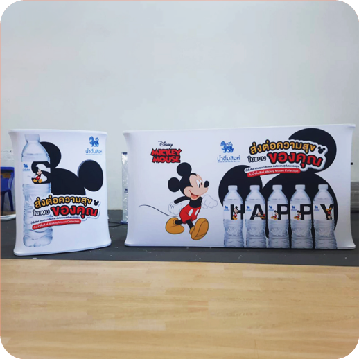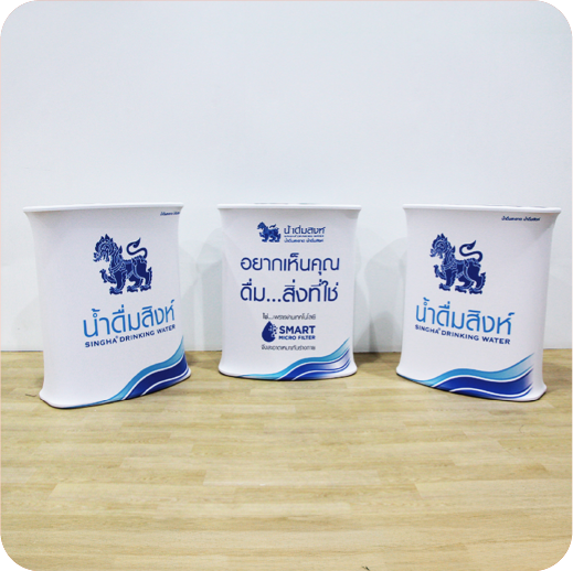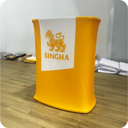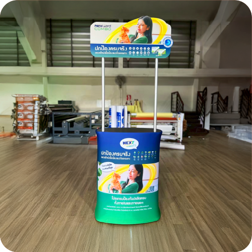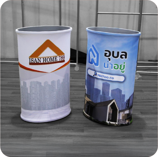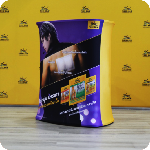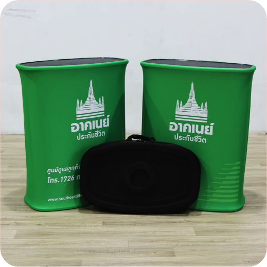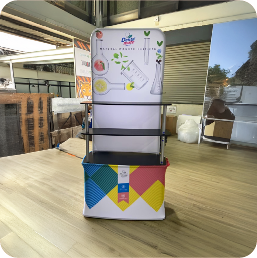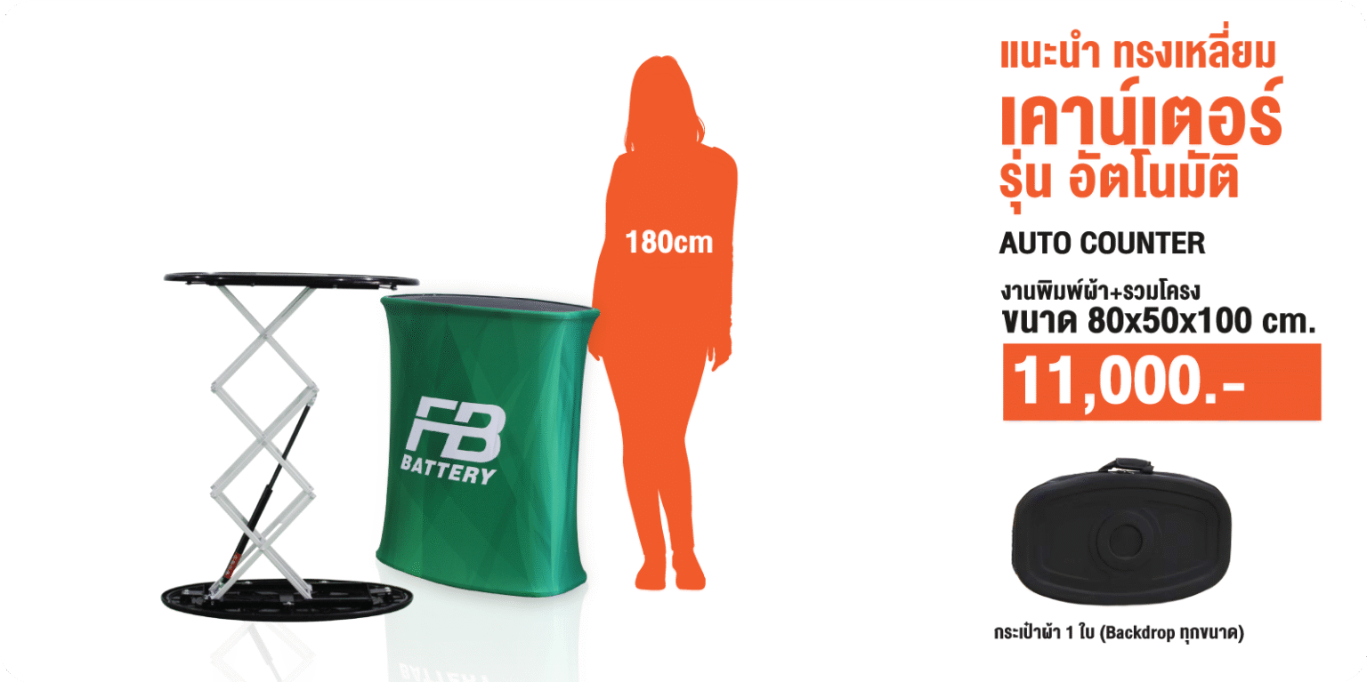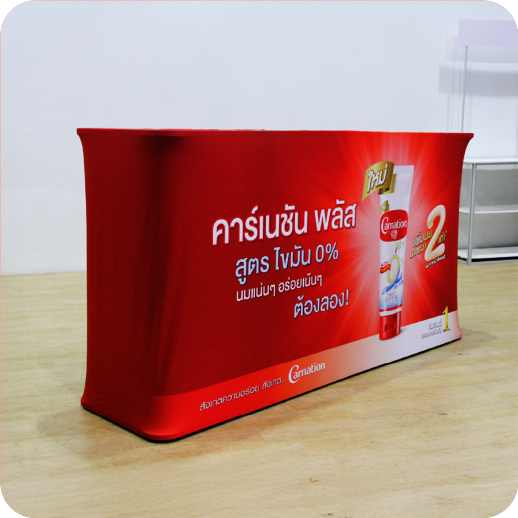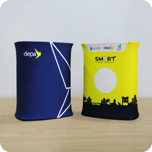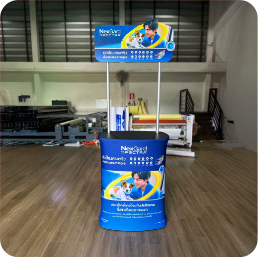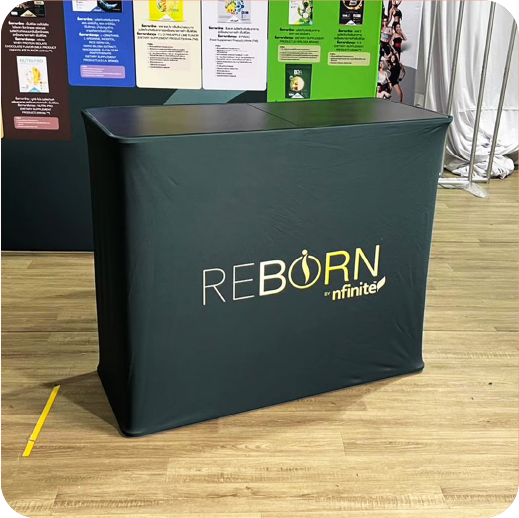 เป็นเคาน์เตอร์แบบพับเก็บได้ ใช้สำหรับออกบูธหรือจัดแสดงสินค้า โครงสร้างน้ำหนักเบา พร้อมแผงกราฟิกหุ้มรอบ ทำให้ดูสวยงามและเป็นมืออาชีพ