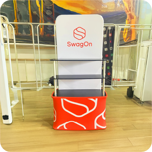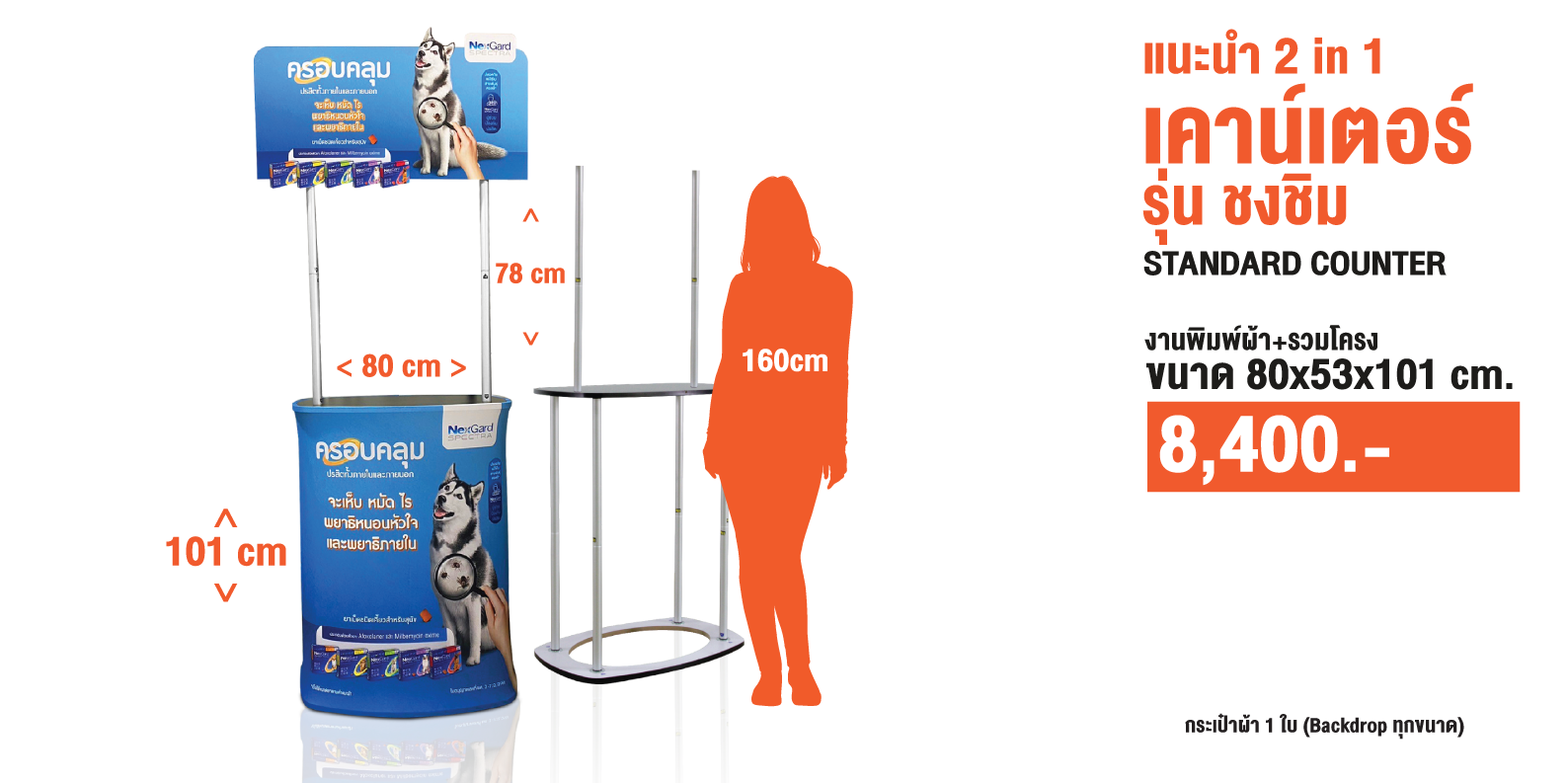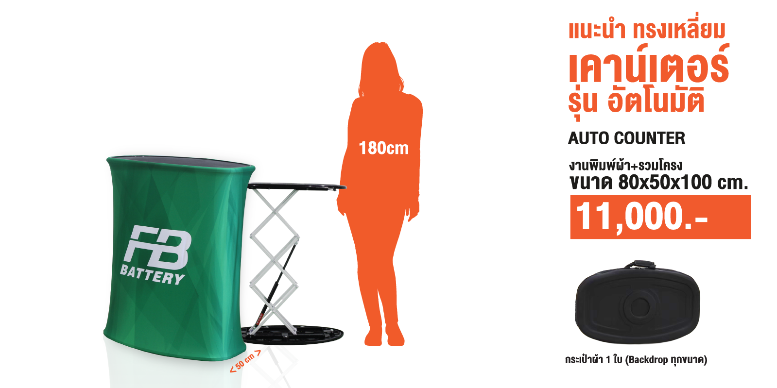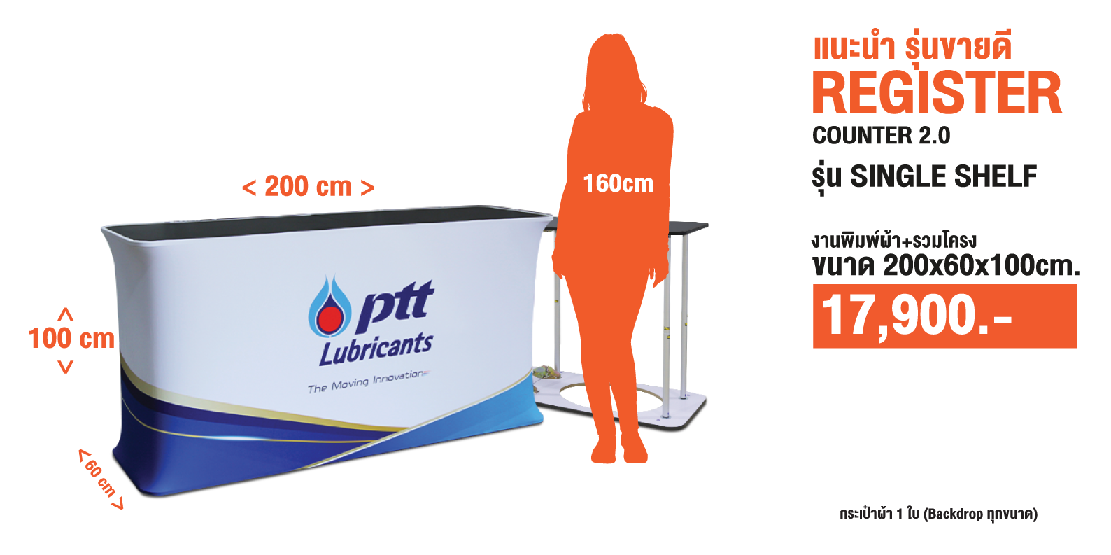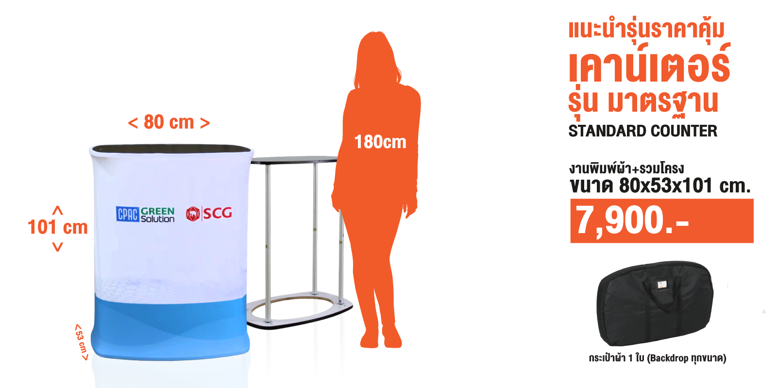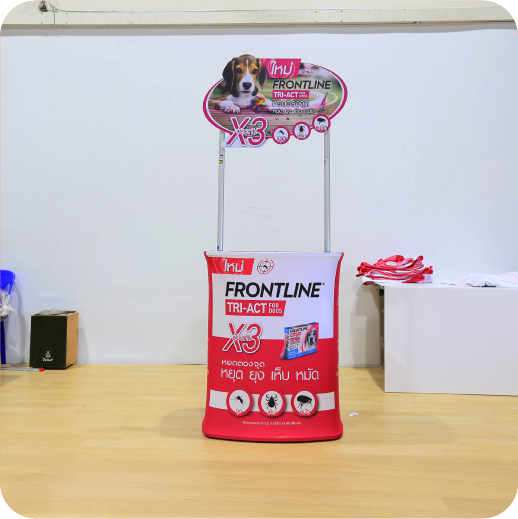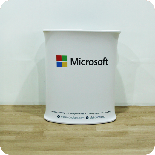 เป็นเคาน์เตอร์แบบพับเก็บได้ ใช้สำหรับออกบูธหรือจัดแสดงสินค้า โครงสร้างน้ำหนักเบา พร้อมแผงกราฟิกหุ้มรอบ ทำให้ดูสวยงามและเป็นมืออาชีพ
