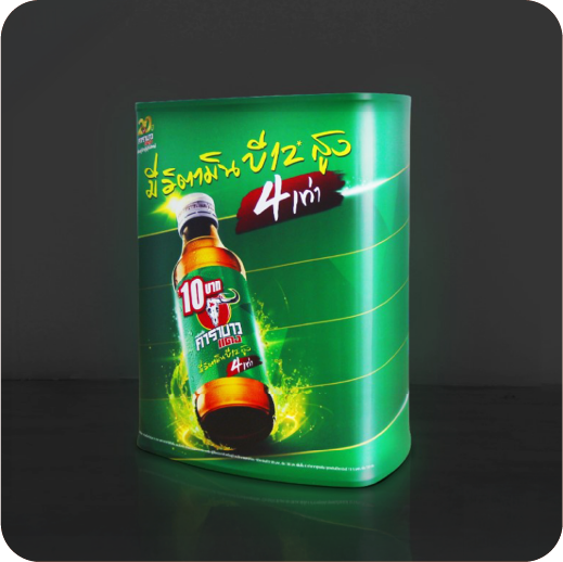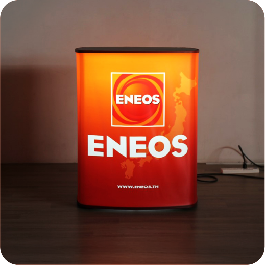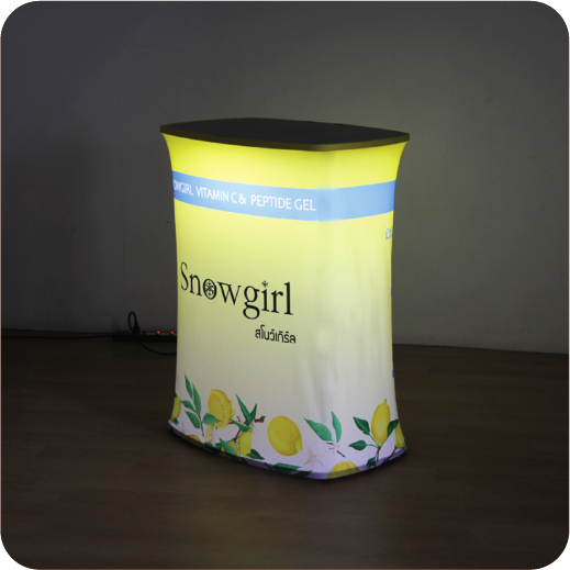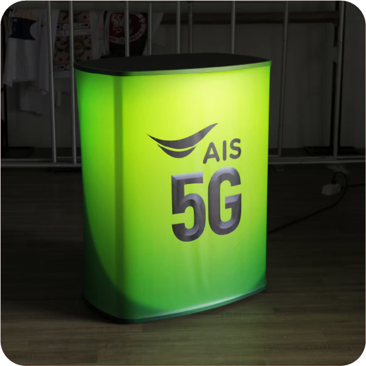 เป็นเคาน์เตอร์ที่มีระบบไฟ LED ภายใน ทำให้กราฟิกด้านหน้าสว่างโดดเด่น ช่วยเพิ่มความน่าสนใจให้บูธหรือหน้าร้าน เหมาะสำหรับงานที่ต้องการดึงดูดสายตา
