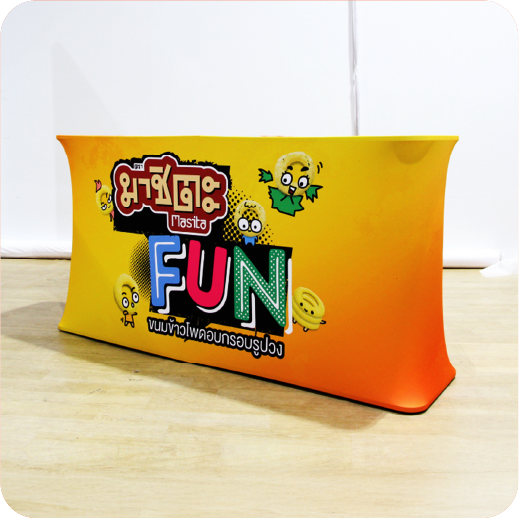เคาน์เตอร์ผ้ารุ่น โต๊ะชงชิม เคาน์เตอร์ออกบูธ หรือบูธชงชิม (Fabric Counter) หรือเคาน์เตอร์แสดง สินค้ารูปแบบผ้ารุ่นพิเศษ สามารถพับเก็บได้ เหมาะสำหรับการใช้งานที่ต้องการเคลื่อนย้าย น้ำหนักเบา สามารถใช้คู่กับ Backdrop ผ้า สำหรับงานแสดงสินค้าและงานอีเวนท์ ด้านบนเคาน์เตอร์สามารถติดตั้ง ป้ายโลโก้จากวัสดุที่หลากหลายตามความต้องการ