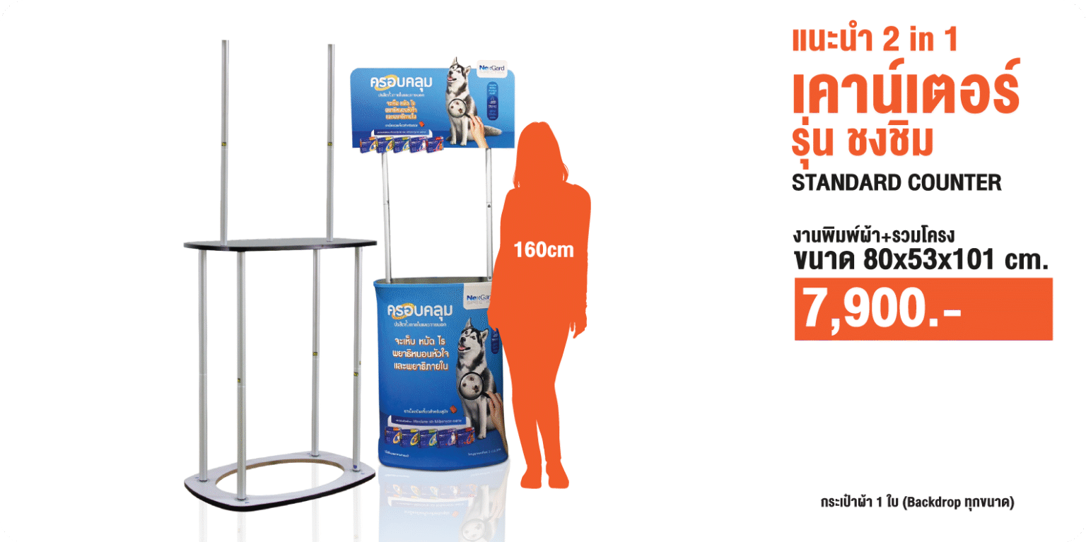 เคาน์เตอร์ผ้ารุ่นมาตรฐานมีทั้งหมด 4 รุ่น คือ Oval, Square, Long-Oval และ Round Bar เหมาะสำหรับงานเปิดตัวสิ้นค้างานโชว์สินค้า วางโชว์ออกอีเวนท์ต่างๆ ประกอบด้วยโครงอง อมิเนียม, ฐานแผ่นไม้, แผ่นไม้สำหรับวางสินค้าและงานผ้าพิมพ์