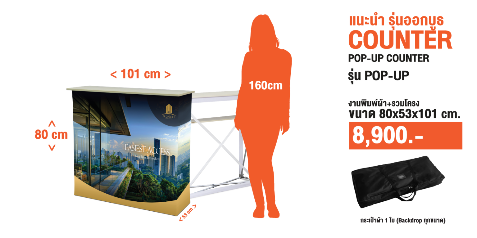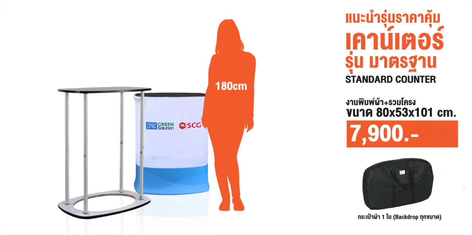 เป็นเคาน์เตอร์สำเร็จรูปที่ใช้สำหรับออกบูธ แสดงสินค้า หรือเป็นจุดต้อนรับลูกค้า มีโครงสร้างแข็งแรง พร้อมพื้นที่วางสินค้า และสามารถติดกราฟิกแบรนด์ด้านหน้าได้