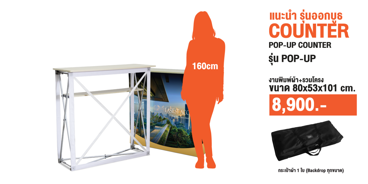 เป็นเคาน์เตอร์ที่ออกแบบให้กางใช้งานได้ทันทีด้วยระบบโครงสร้างอัตโนมัติ (Pop-up) เพียงดึงขึ้นก็สามารถใช้งานได้เลย เหมาะสำหรับงานออกบูธที่ต้องการความรวดเร็ว