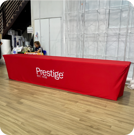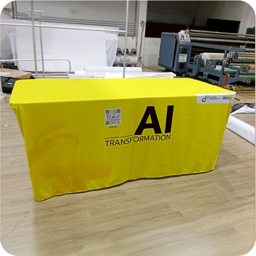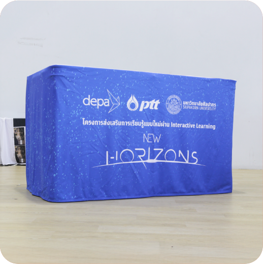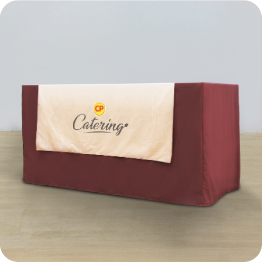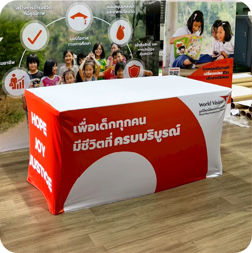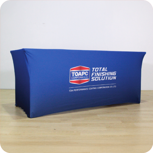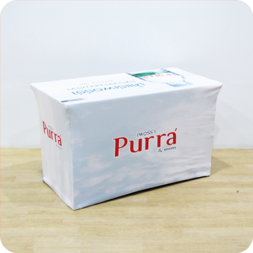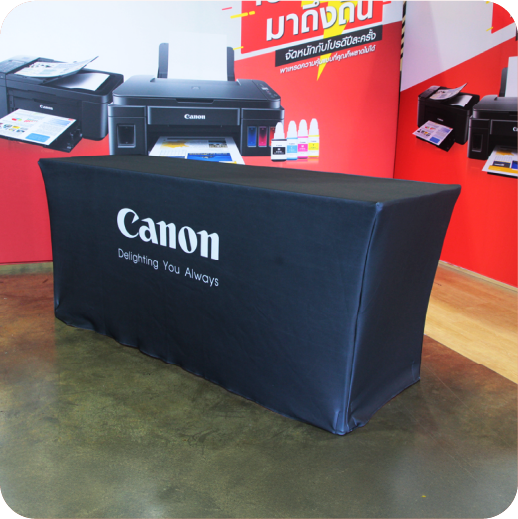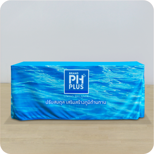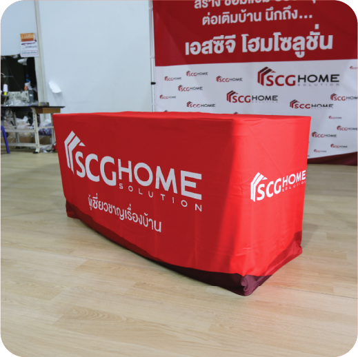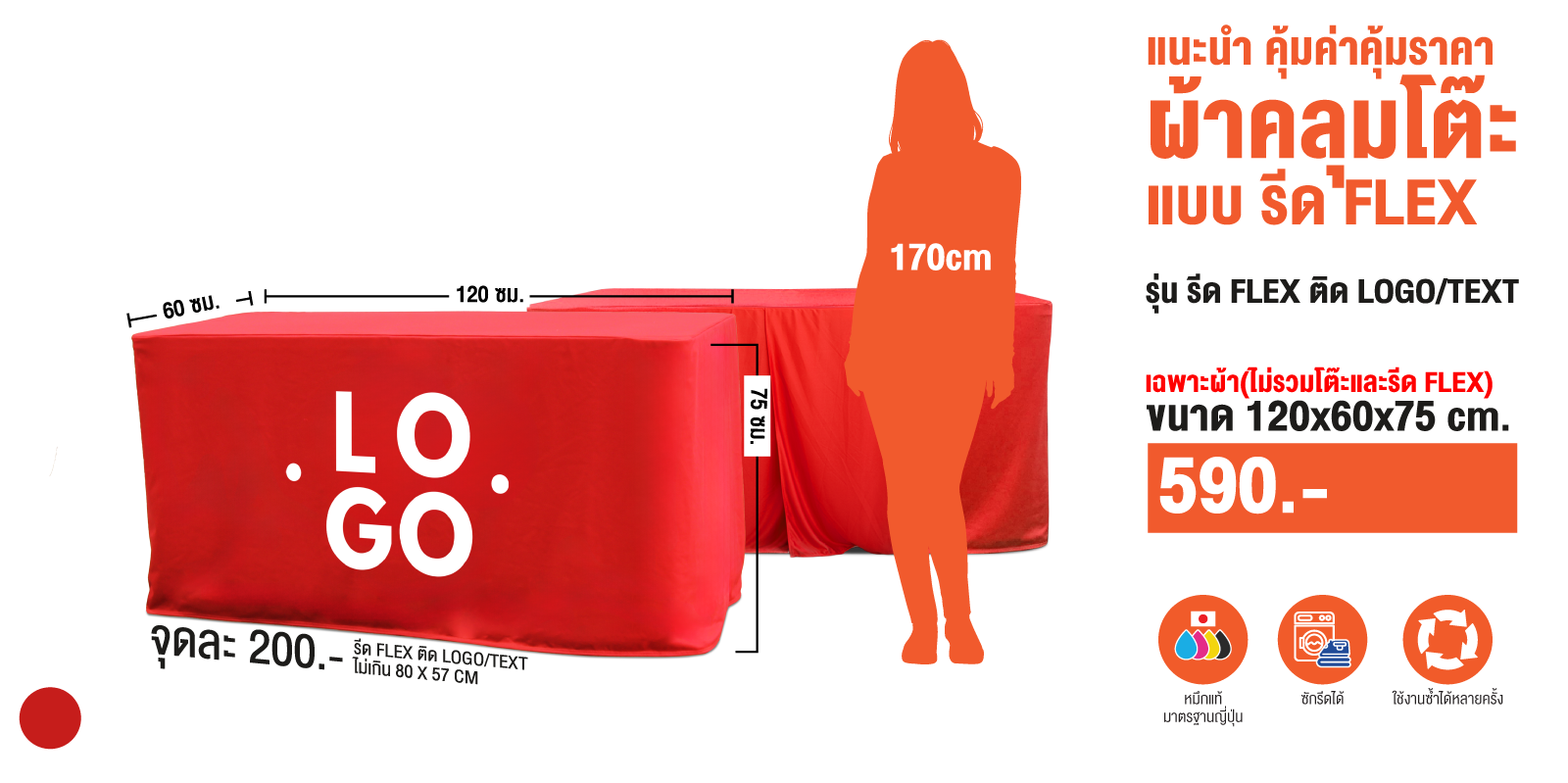 ผ้าคผ้าปูโต๊ะ พิมพ์โลโก้แบบ รีด FLEX สำหรับโต๊ะมี 6 สี ผลิตโดยใช้ผ้าใยสังเคราะห์ เนื้อผ้าหนานุ่มสามารถ ซักได้ และ รีดได้ด้วยเครื่องซักผ้าปกติ งานพิมพ์ผ้าแบบ Dye- Sublimation ทำให้ภาพ และ โลโก้ที่คมชัด สูง สามารถพิมพ์โลโก้ที่คงทนยาวนาน สามารถใช้คู่กับBackdrop ผ้า (Fabric Backdrop) สำหรับงาน แสดง สินค้า และ งานอีเวนท์ (Event and Exhibition)