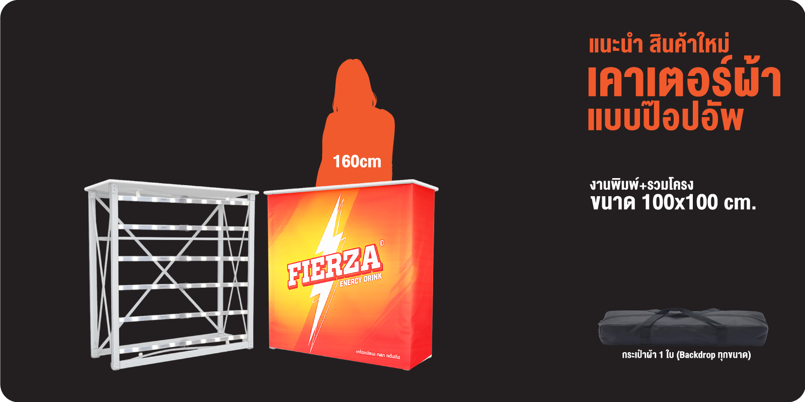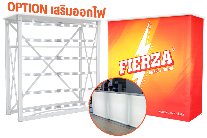 คือเคาน์เตอร์แสดงสินค้าที่ออกแบบมาเพื่อการใช้งานในงานอีเวนต์ บูธแสดงสินค้า และงานออกบูธ ทุกรูปแบบ โครงสร้างอลูมิเนียมแบบป๊อปอัพ แข็งแรง น้ำหนักเบา ติดตั้งง่าย รวดเร็ว พร้อมผ้าพิมพ์ ระบบ SEG ที่ให้ภาพเรียบตึง สวยงาม ไร้รอยต่อ เพิ่มความโดดเด่นให้แบรนด์ของคุณ