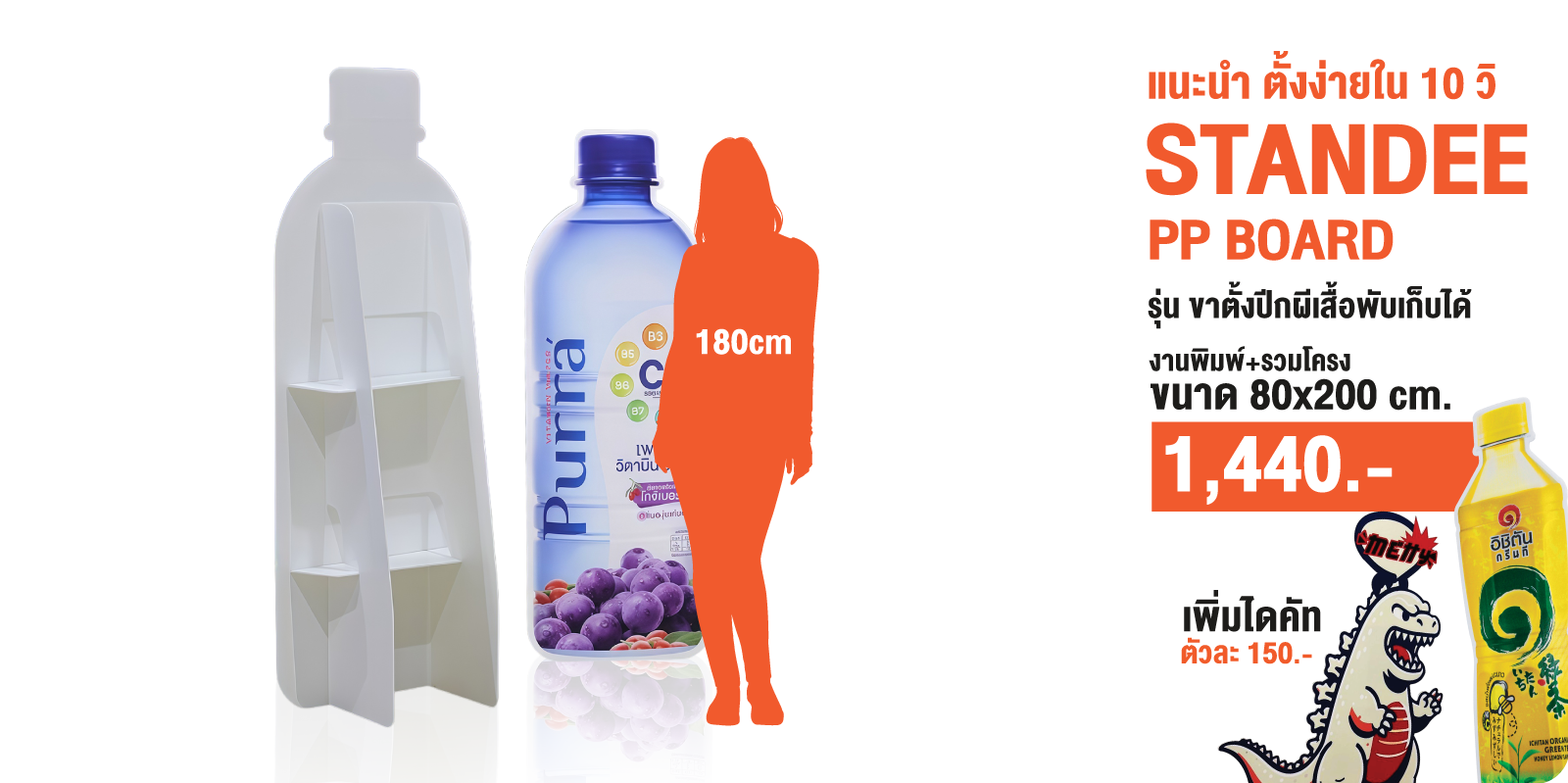 *สแตนดี้มาตรฐาน ผลิตด้วย PP Board สีขาวหนาพิเศษ 4 มม. **งานพิมพ์พร้อมขาตั้งปีกผีเสื้อพับเก็บได้ หนาพิเศษ 4 มม.